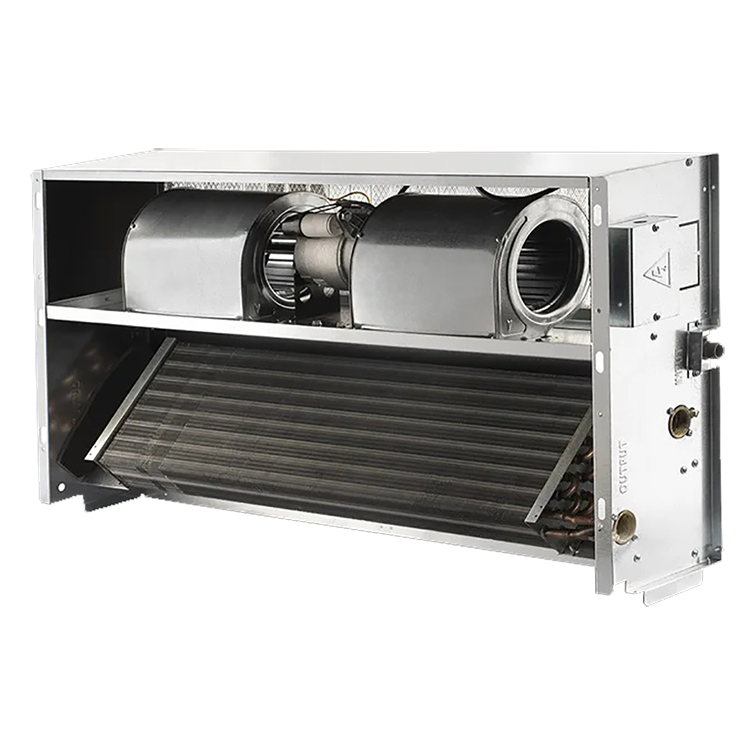 فن کویل های سقفی توکار دارای ارتفاع 21 سانتیمتر هستند و از دو طرف دارای خروجی درین می باشند.